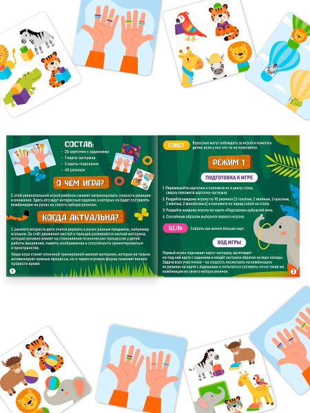 Настольная игра «Тянучки на ручки. Каникулы в Африке», развивающая, 28 карт, 5+. Развиваем ловкость пальчиков, внимательность и быстроту реакции в увлекательной игровой форме! В этой динамичной игре вас ждут захватывающие испытания с разноцветными резинками. Соберите веселую компанию друзей или родных и устройте азартные состязания на скорость! Что нужно делать? Задача игроков — собрать как можно больше выполненных карточек. А сделать это помогут резиночки на пальцах. На карточках изображены различные комбинации, которые нужно воспроизвести на пальцах с помощью резинок. Как только игрок справился с заданием, он громко объявляет: “Готово!”. И начинается проверка: <ul> <li> если все верно, игрок забирает карту себе;</li> <li> если неправильно, карта уходит в колоду сброса.</li> </ul> А побеждает тот, кто наберет больше всего карточек! Внутри вы найдете: <ul> <li> 30 карточек с заданиями</li> <li> 36 резинок</li> <li> правила игры</li> </ul> Идеальный выбор для активного досуга и развития малышей в кругу семьи и друзей!