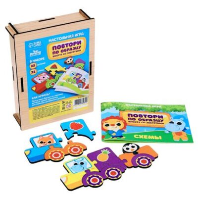 Настольная игра «Повтори по образцу вместе со зверятами». Повтори по образцу — это эффективный тренажер для развития мышления и пространственного ориентирования. <b> Как играть</b> <ul> <li> Рассмотрите с малышом все фигурки.</li> <li> Выберите одну схему и покажите ребенку, как в соответствии с ней расставить фигурки .</li> <li> Придумайте свои варианты заданий.</li> </ul> <b> Чем полезны занятия с игрушкой</b> В процессе выполнения заданий малыш научится ориентироваться в пространстве, освоит понятия «слева — справа», «спереди — сзади».