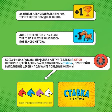 Настольная игра «Лошадиные скачки», 10+. <b> Чья лошадь придет к финишу первой?</b> Скорость, адреналин, азарт — эти и еще множество других эмоций вы испытаете, оказавшись на наших лошадиных скачках. Что нужно делать? Ускорять или замедлять лошадей, исходя из сделанной вами ставки, подставлять соперников и делать все возможное, чтобы ваша ставка оказалась выигрышной. Добейтесь победы любой ценой! <b> Как играть?</b> Поместите поле в центре стола, а рядом с ним — игрушку-сквиш. Поставьте на старт фишки лошадей и раздайте каждому игроку по 1 карте «Ставка». Осталось только определить очередность хода и начать игру! В свой ход игрок бросает кубики. В зависимости от выпавшего значения на кубиках участники будут выполнять определенные действия. Например, как можно скорее хлопнуть по карте с изображением лошади или схватить игрушку-сквиш, а может быть, просто переместить лошадку. <b> Как используются ставки в игре?</b> Каждая карта «Ставка» имеет 3 задания, которые надо выполнить. <ul> <li> Цель 1 — цвет фишки опережающей всех лошади.</li> <li> Цель 2 — цвет фишки второй лошадки.</li> <li> Цель 3 — цвет фишки последней лошади.</li> </ul> Также в игре есть карты «Внезапное событие», которые могут в корне изменить процесс игры. Как? Например, лошадь-лидер может поменяться местами с аутсайдером. Когда одна из фишек лошади встанет на клетку «Финиш», игра заканчивается. Участники делают следующее: <ul> <li> Вскрывают свои карты «Ставка» и проверяют достижения указанных в них целей.</li> <li> При необходимости берут жетоны победных очков.</li> <li> Считают количество победных очков. Игрок, который набрал их больше всех, объявляется победителем!</li> </ul> <b> Внутри вы найдете</b> <ul> <li> Игровое поле.</li> <li> Поле «Шлеп».</li> <li> 6 фишек лошадей с подставками.</li> <li> 82 карты.</li> <li> Жетон проверки выполнения целей.</li> <li> 50 жетонов очков.</li> <li> 2 кубика.</li> <li> 12 наклеек для кубика.</li> <li> Игрушка-сквиш.</li> <li> Правила игры.</li> </ul> <b> Играйте и веселитесь вместе с ЛАС ИГРАС!</b> Дополнительно: У игрового поля есть разрез! Это сделано для того, чтобы оно не топорщилось и хорошо прилегало к поверхности стола во время игры.
