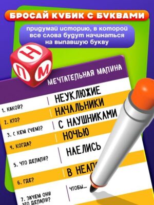 Настольная игра «Сочинятор», от 1 игрока, 7+. Настольная игра «Сочинятор» станет идеальным выбором для семейного досуга, дружеских встреч или даже одиночного отдыха. Эта игра подойдет для всех, кто любит творить, фантазировать и придумывать увлекательные истории. <b> Преимущества</b> <ul> <li> Подходит для детей от 7 лет, а также для взрослых.</li> <li> Развивает фантазию, креативное мышление и коммуникативные навыки.</li> <li> Удобный формат для дома, поездок и праздников.</li> </ul> <b> Цель игры</b> Быстрее всех составить историю, где все слова начинаются на одну букву. Игра длится 6 раундов. <b> Составляем истории</b> <ul> <li> Все используемые слова, кроме предлогов, частиц и союзов, должны начинаться с буквы, которая выпала на кубике.</li> <li> Если не можете придумать слово — просто пропустите вопрос.</li> <li> По желанию ответ можно записать из нескольких слов.</li> </ul> Настольная игра «Сочинятор» — это не просто развлечение, а возможность для каждого участника раскрыть свой творческий потенциал. Возьмите ее с собой в путешествие, на пикник или используйте для семейного вечера — скучно точно не будет!