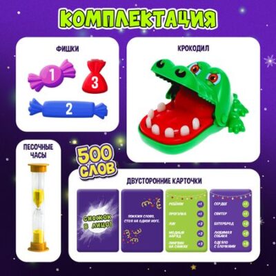 Настольная игра «Новогодний крокодил», от 2 игроков, 5+. «Новогодний крокодил» — веселая настольная игра на угадывание слов станет отличным дополнением к любой вечеринке. Проверьте свою удачу вместе с озорным крокодилом! <b> Как играть?</b> Первый участник берет карточку и показывает за время слово, написанное на ней. Остальные игроки пытаются его разгадать. Цель игры — набрать как можно больше очков за каждое угаданное участниками слово. Если время закончится, а правильный вариант не прозвучит, то карточка убирается и больше не возвращается в игру. Во время объяснения можно использовать только жесты, мимику и позы. Нельзя разговаривать, произносить слова губами, издавать звуки, рисовать на стене, бумаге и т. д. Участник может использовать предметы, которые находятся при нем. Нажимайте на один из зубов крокодила, чтобы проверить свою удачу. Если нажимаете на «неправильный» зуб — пасть закрывается и вы переходите в следующую игру «Супер-сет». За ограниченное количество времени вы рассказываете участникам 5 слов с карточки. Есть возможность получить сразу 10 баллов. Но если игроки не угадали слова, то все баллы сгорают. Более подробные правила игры смотрите в инструкции. Игра рекомендована детям старше 5 лет. Рассчитана на 2 и более участников. Попробуйте отгадать 500 слов и стать победителем битвы интеллектуалов! <b> Веселой игры!</b>