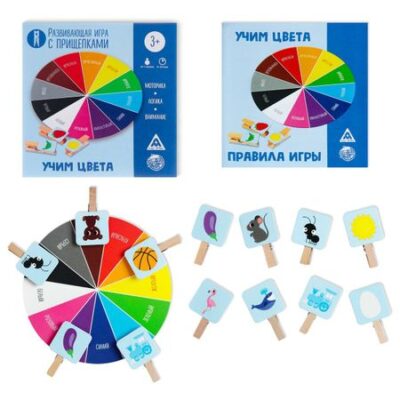 Настольная игра «Учим цвета» с прищепками, 3+. <b> Развивающая игра с прищепками</b> Благодаря этой игре ребенок познакомится с основными цветами. А помогут ему в этом прищепки! <b> Как играть?</b> Для начала поместите игровое поле перед ребенком. Прищепки расположите рядом с полем. Главная задача — правильно разместить все 12 прищепок. Каждый сектор имеет свой цвет, а всего их 12. На прищепках находятся предметы или животные того или иного оттенка. На каждый сектор приходится только одна прищепка. Попросите малыша взять любую прищепку. Что это такое? Какого оно цвета? Попросите ребенка прикрепить эту прищепку на соответствующую часть поля. В правилах есть другие варианты игры. <b> Внутри вы найдете</b> <ul> <li> Игровое поле.</li> <li> 12 прищепок.</li> <li> 12 фишек на прищепки.</li> <li> Правила игры.</li> </ul> <b> Играйте и развивайтесь вместе с ЛАС ИГРАС!</b>