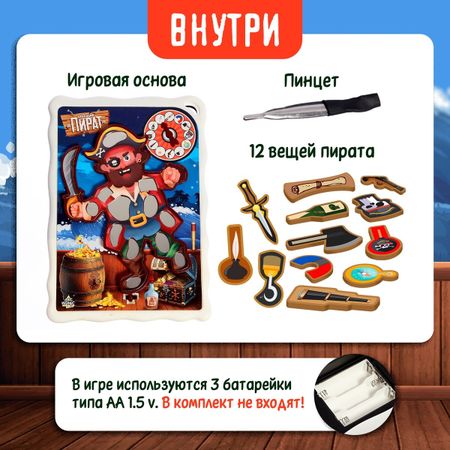 Настольная игра «Операция Пират», 2 игрока, 5+. «Операция: Пират» — настольная игра для детей от 5 лет. Свирепый пират напал на морское судно и стащил драгоценности у моряков. Задача малыша — проявить храбрость и забрать у разбойника украденные вещи. <b> Цель игры</b> Забрать у пирата вещи, не разбудив его. <b> Ход игры</b> <ul> <li> По очереди вращайте рулетку, чтобы узнать из какого «кармана» вы будете вытаскивать улов.</li> <li> Используя пинцет, осторожно вытащите предмет, стараясь не задеть стенки «кармана».</li> <li> Если задеть стенку кармана, пират проснется, и вы останетесь без улова.</li> <li> Победит, тот, кто достанет больше предметов из кармана Джека.</li> </ul> Играя в настольные игры, ребенок разовьет внимание, прокачает моторику и весело проведет время.