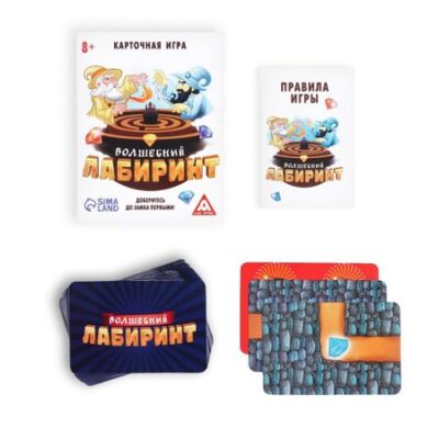 Настольная игра «Волшебный лабиринт», 29 карт, 4 фишки, 8+. <b> Игра для настоящих волшебников!</b> В одной далекой стране король издал указ: волшебник, который сможет пройти лабиринт и быстрее всех добраться до замка, будет признан величайшим магом! Сделать это под силу лишь избранному. Прогуляйтесь по магическим тропинкам, соберите волшебные самоцветы и достигните ворот королевства первыми. <b> Как играть?</b> Для начала поместите в центре стола карту с замком. Карты с дорожками перемешайте и раздайте каждому игроку по 4 карты. Разделитесь на 2 команды: волшебники Солнца и волшебники Луны. Солнечные волшебники берут себе фишки желтого цвета, а Лунные — синего. Первый игрок команды выбирает из своих карт одну и выкладывает ее на край стола напротив карты с замком. Карты можно выкладывать только горизонтально. <b> Внимание:</b> прежде чем выложить первую карту, мысленно проложите между ней и замком 5 карточек. Далее игрок кладет на выложенную карту свою фишку и передвигает ее так далеко, насколько это возможно. Затем игрок добирает себе карту из колоды. После этого ход переходит к игроку другой команды. Он так же выбирает карту, кладет ее вплотную к уже выложенной карте другого участника. В случае, если игрок не может выложить карту на поле, он может сбросить одну карту в отдельную стопку сброса и заменить ее новой картой из основной колоды. В комплекте есть карты со специальными значениями, которые добавят игре азарта и сделают ее еще более интересной. Для того чтобы победить, одна из команд должна дойти до королевского замка. Если в игре есть несколько участников с одинаковыми камнями, то эти игроки являются союзниками. Когда один из них доходит до замка, то побеждают оба игрока! <b> Внутри вы найдете:</b> <ul> <li> 29 карт,</li> <li> 3 карты с жетонами,</li> <li> карту с фишками,</li> <li> правила игры.</li> </ul> <b> Играйте и веселитесь вместе с ЛАС ИГРАС!</b>