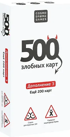 В наборе ещё 200 новых карт для популярной игры! Дополнение идеально для тех, кто заиграл основную колоду «500 злобных карт» до дыр.