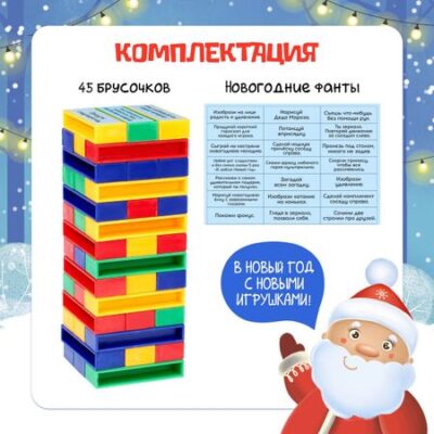 Настольная игра «Падающая башня. Новогодние фанты», 2-4 игрока, 5+. «Падающая башня» — это популярная игра на реакцию и внимание. Мы сделали ее еще интереснее: каждый брусок содержит уникальное новогоднее послание. <b> Подготовка к игре</b> <ol> <li> Приклейте наклейки с заданиями на брусочки.</li> <li> Соберите башню. Каждый уровень должен состоять из 3 брусков. Кирпичики одного уровня кладутся перпендикулярно по отношению к кирпичикам другого уровня.</li> </ol> <b> Начинаем игру</b> По очереди вытягивайте по одному брусочку и выполняйте задания с них. Игра закончится, когда башня упадет. А проиграет тот, кто ее уронит.