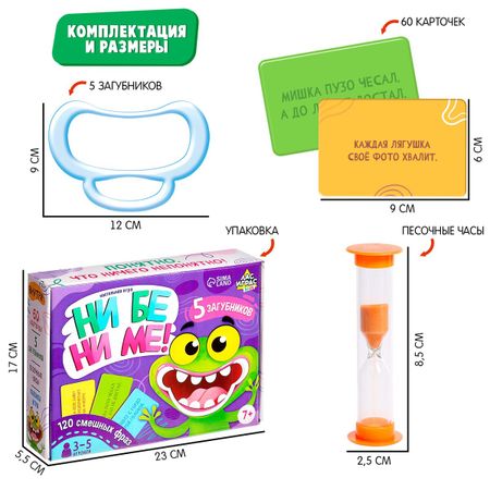 Настольная игра «Ни бе ни ме!», 3-5 игроков, 7+. Докажите друзьям, что вы самый внимательный слушатель! В настольной игре «Ни бе ни ме!» ваш соперник с загубником во рту будет проговаривать слова со своей карточки, а вам нужно слушать и высказывать предположения, чтобы догадаться, что же он хотел сказать. Проявите всю свою внимательность, чтобы победить! <b> Подготовка к игре</b> <ol> <li> Перед игрой обязательно обработайте загубники антисептическим раствором или помойте их с мылом.</li> <li> Каждому игроку раздайте по одному загубнику.</li> <li> Выберите сторону карточек, которой будете играть, и сложите в колоду стола этой стороной вниз.</li> <li> В центре стола расположите песочные часы.</li> </ol> <b> Как играть</b> <ol> <li> Определите очередность игроков. Пусть первым ходит игрок, которому удалось быстрее всех надеть загубник. Далее участники ходят по часовой стрелке.</li> <li> Ведущий игрок надевает загубник, переворачивает песочные часы и берет верхнюю карту из колоды.</li> <li> Задача ведущего — составить из слов на карточке фразу и с загубником во рту произнести ее.</li> <li> Цель остальных участников — разобрать и повторить фразу, сказанную ведущим, пока не закончился песок в часах.</li> <li> Игрок, правильно повторивший фразу, забирает карточку себе.</li> <li> Карточка убирается вниз колоды, если ни один участник не смог повторить слова ведущего.</li> <li> Ведущий может повторить фразу по просьбе игроков. Если у него есть время, он может взять другую карточку.</li> <li> Сыграйте несколько раундов так, чтобы участники побывали ведущими одинаковое количество раз.</li> <li> Побеждает игрок, который сумеет набрать наибольшее количество карточек.</li> </ol> <b> Чем полезна настольная игра</b> С настольной игрой «Ни бе ни ме!» ребенок научится концентрировать внимание и улучшит дикцию и произношение. Проговаривать фразы с загубником во рту ничуть не легче, чем их отгадывать! Поэтому с игрой, кроме удовольствия и радостного смеха, ребенок получит новый ценный опыт! Настольная игра «Ни бе ни ме!» рекомендована для детей от 7 лет. Рассчитана на 3–5 игроков.