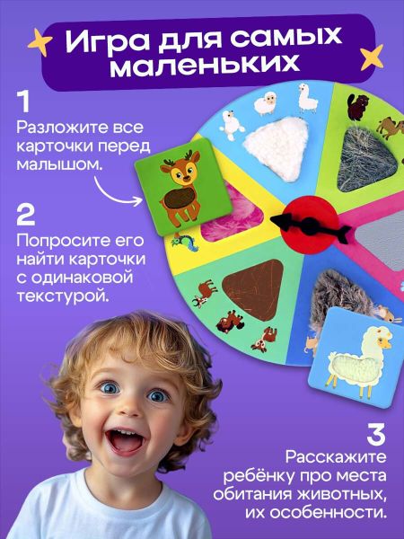 Настольная игра «Тактильное лото», 3+. «Тактильное лото. Животные» — настольная игра для детей от 3 лет. Ребенок попадет с зоопарк, где сможет погладить зверюшек и поиграть с ними. Благодаря мягким элементам кроха запомнит внешний вид зверей и их названия. <b> Ход игры</b> <ul> <li> Сложите все карточки в мешочек.</li> <li> Самый младший игрок раскручивает стрелку, пока она не укажет на один из секторов.</li> <li> Рулетка укажет на животное, которое нужно найти.</li> <li> На ощупь ребенок должен найти в мешке карточку с такой же текстурой.</li> <li> Если игроку удалось это сделать, он оставляет карточку себе.</li> <li> Если игрок достал неверную карточку, он кладет ее обратно в мешок. Ход переходит к следующему участнику.</li> <li> Раунд заканчивается, когда заканчиваются карточки в мешочке.</li> <li> Выигрывает игрок с большим количеством карточек.</li> </ul> <b> Вариант игры для самых маленьких</b> <ul> <li> Разложите все карточки перед малышом и попросите его найти карточки с одинаковой текстурой.</li> <li> Расскажите ребенку про места обитания животных, их особенности.</li> </ul> <b> Особенности</b> <ul> Играть безопасно даже самым маленьким деткам.Тактильные элементы представлены меховыми вкладками, напоминающими шерсть животных.</ul> Играя в увлекательную игру, малыш прокачает мелкую моторику, разовьет логическое мышление, память и расширит кругозор.