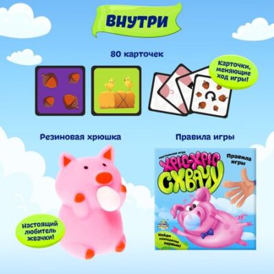 Настольная игра «Хрю-хрю схвачу», 3-8 игроков, 7+. «Хрю-хрю схвачу» — веселая и динамичная настольная игра на внимательность и скорость реакции. Вам предстоит искать совпадения на карточках и схватить свинку вперед всех! <b> Как играть</b> <ul> <li> Цель игры — избавиться от всех карт на руках.</li> <li> Первый участник переворачивает одну карту из своей колоды. Далее по часовой стрелке игроки выкладывают по одной карте.</li> <li> Если на столе открыты карты с одинаковым рисунком, то владельцы этих карт устраивают борьбу за свинку.</li> <li> Если рисунки на картах разные, игроки продолжают выкладывать карты.</li> </ul> <b> Борьба за свинку</b> Ваша задача — первым схватить свинку, если рисунок на вашей карте совпал с картой другого игрока. Победивший в борьбе отдает все свои карты из открытой стопки, кроме верхней, проигравшему. Победит тот игрок, который скинул все свои карты первым!