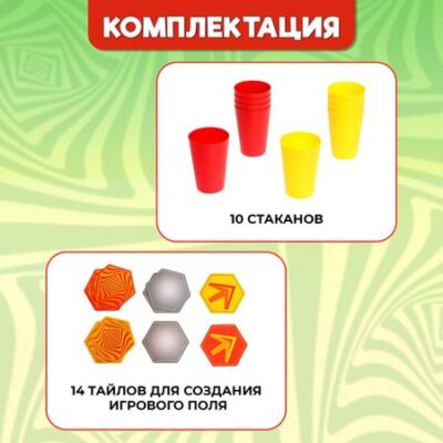 Настольная игра «Прыгучий стакан», 2 игрока, 7+. Застаканьте свое место с настольной игрой «Прыгучий стакан»! Вам предстоит двигать свои стаканы к финишу, просчитывать ходы наперед и блокировать стаканы соперника, чтобы первым занять его место на поле. Будьте внимательны, ведь соперник не упустит возможность проделать то же самое! <b> Подготовка к игре</b> Разложите 14 тайлов в прямую линию по инструкции, чтобы создать игровое поле. <b> Как играть</b> Задача каждого игрока — первым переместить свои стаканы на тайлы соперника. <ol> <li> Определите очередность игроков.</li> <li> Выберите цвет стаканов и расставьте их на соответствующих тайлах.</li> <li> В свой ход передвиньте один из ваших стаканов по направлению к вашим финишным тайлам.</li> <li> Пропускать ходы нельзя.</li> <li> Побеждает игрок, который передвинет все свои стаканы на финишные тайлы. <b> Как двигать стаканы</b> <ul> <li> За ход можно передвинуть только один стакан. Стопки стаканов двигать нельзя.</li> <li> Перемещать можно только стаканы своего цвета.</li> <li> Двигайте только «свободные» стаканы. Те, которые стоят на вершинах стопок или по одному.</li> <li> Стакан сдвигается на столько тайлов, сколько стаканов было в стопке, на которой он стоял.</li> <li> Стаканы могут двигаться только по направлению к своему финишу.</li> </ul> <b> Чем полезна настольная игра</b> С настольной игрой «Прыгучий стакан» ребенок прокачает логическое мышление, внимательность и приобретет начальные стратегические навыки. Ведь просто двигать стаканчики не получится — нужно тщательно продумывать ходы, блокировать стаканы соперника и не давать ему блокировать свои! Настольная игра «Прыгучий стакан» рекомендована для детей от 7 лет. Рассчитана на 2 игроков. </li> </ol>