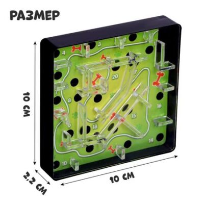 Настольная игра детей на логику «Веселый лабиринт», 1 игрок, 5+. Песик заблудился и потерял дорогу к дому. Помогите ему отыскать правильный путь и полакомиться своей любимой косточкой! Занимательная игра-головоломка «Веселый лабиринт» представляет собой игровое поле, шарик и множество лунок-отверстий с извилистыми дорожками. Ваша задача — пройти шариком весь лабиринт, следуя стрелке с цифрами. Будьте внимательны! На поле расположено множество лунок, которые желают захватить ваш шарик. Наклоняйте игру в разные стороны, чтобы песик дошел до своей косточки. Иначе вам придется начать свой путь заново! Настольная игра «Веселый лабиринт» рекомендована детям старше 5 лет и рассчитана на 1 игрока. Вы можете по очереди устраивать соревнования, кто быстрее дойдет до финиша. Игра развивает моторику, скорость мышления, реакцию, координацию и заряжает спортивным духом! <b> Вперед к финишу — вперед к победе!</b>