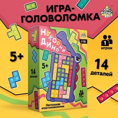 Накорми Дино» — настольная игра для детей от 5 лет. Озорной дракончик обожает логические задачки, но для эффективного прохождения головоломки нужно отлично подкрепиться. Задача малыша — накормить динозавра, сложив все фигурки в основу.Как игратьЗагрузите фигурки в игровую основу.Заполните поле без пробелов и закройте перегородку сверху.Если у вас не получилось, выдвинете нижнюю часть поля, уберите из неё фигурки и задвиньте обратно.С увлекательной головоломкой ребёнок весело и с пользой проведёт время, развивая логическое мышление , внимание и мелкую моторику.