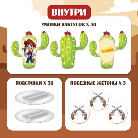 Настольная игра для детей на везение «Ковбои против шерифа», 2 игрока, 5+. «Ковбои против шерифа» — захватывающая настольная игра для настоящих ковбоев! Переворачивайте фишки, ищите золотые слитки и не попадитесь шерифу! <b> Особенности</b> <ul> <li> Игровое поле состоит из кактусов.</li> <li> Кактусы могут быть пустыми, в них могут находиться золотые слитки, или з ними прячутся шерифы, указатели и подельники.</li> <li> Простые правила, понятные даже детям.</li> <li> Увлекательный и азартный игровой процесс.</li> <li> Развивает внимание, реакцию и стратегическое мышление.</li> </ul> <b> Как играть?</b> <ul> <li> Разделитесь на команды и расставьте кактусы на поле.</li> <li> По очереди переворачивайте кактусы соперников и ищите золотые слитки.</li> <li> Если найдете шерифа, отдайте сопернику кактус со слитком.</li> <li> Первый игрок, собравший три слитка, выигрывает раунд.</li> <li> Победитель игры — тот, кто первым соберет два победных жетона.</li> </ul> «Ковбои против шерифа» — идеальная игра для вечеринок, семейных вечеров и детских праздников. Она подарит массу положительных эмоций и поможет весело и с пользой провести время.