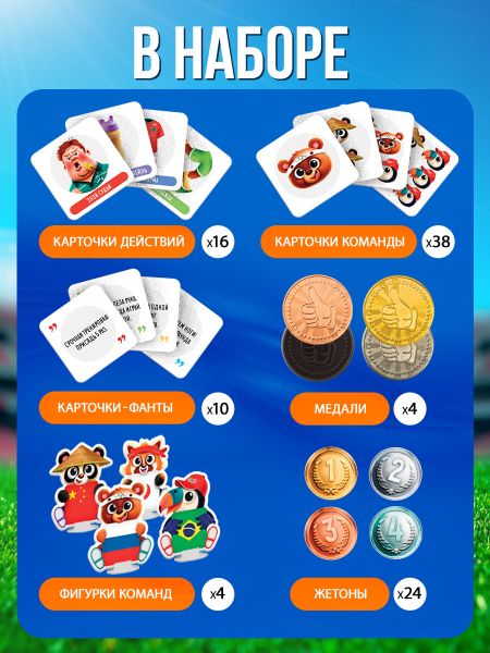 Настольная игра для детей на внимание «Звероигры», 2-4 игрока, 5+. «Звероигры» — настольная игра для детей от 5 лет. Добро пожаловать на увлекательные олимпийские игры среди самых ловких жителей волшебного леса. Малышу предстоит выступить в роли тренера и помочь пушистым непоседам добиться успеха и стать опытными спортсменами. <b> Цель и игры</b> Найти на стадионе как можно больше зверей. <b> Подготовка к игре</b> <ul> <li> Игроки выбирают флаг и кладут его перед собой. На каждом флаге изображено животное — символ страны.</li> <li> Перемешайте карточки стадиона и разложите их на столе рубашкой вверх. Это будет ваш олимпийский стадион.</li> <li> Жетоны медалей положите стопкой на край стола.</li> <ul> <b> Ход раунда</b> <ul> <li> Игроки стартуют одновременно: каждый из них переворачивает карточку с заданием в центре стола. Открытые карточки должны быть видны всем игрокам.</li> <li> Открыв карточку, игрок выполняет действие, которое зависит от вида карточки стадиона.</li> <li> Выполнив действие, игрок как можно быстрее переворачивает следующую карточку. И так далее до конца раунда.</li> </ul> <b> Конец раунда</b> <ul> <li> Раунд заканчивается, когда открыто столько карточек «Злого судьи», сколько в игре учувствует людей.</li> <li> Игрок, собравший большее количество зверей в свою команду, получает жетон с медалью за первое место. Далее игроки получают жетоны с цифрами по убыванию количества собранных зверей.</li> </ul> <b> Новый раунд</b> <ul> <li> Карточки стадиона перемешиваются и раскладываются на столе.</li> <li> В новом раунде игроки передают свой флаг соседу слева: Теперь игроки будут собирать новых зверей-олимпийцев в соответствии со своим флагом.</li> </ul> <b> Конец раунда</b> <ul> <li> Игра продолжается 4 раунда.</li> <li> В конце игры участники подсчитывают общее количество собранных баллов: Сложите цифры собранных жетончиков.</li> <li> Игрок с наиумнейшим количеством получает медаль за первое место.</li> </ul> <b> Увлекательно и полезно!</b> С увлекательной настольной игрой ребенок разовьет внимание, коммуникативные навыки и воображение. </ul> </ul>