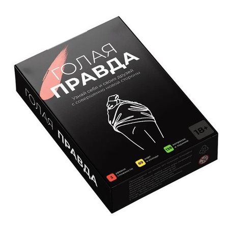 Голая Правда — настольная игра для компании друзей, которые не боятся «оголиться» друг перед другом.В комплекте более 130 откровенных вопросов и заданий.Игрокам дается выбор — ответить на каверзный вопрос или выполнить фанты.Карточки делятся на уровни — от простого к сложному. За каждую сыгранную карточку даются баллы в соответствии с уровнем сложности.Игрок, который наберет меньше всего баллов, считается проигравшим. Он должен выполнить финальное задание, которое придумают все игроки.Играйте вдвоем или большой компанией; дома или на вечеринке — главное условие — будьте открыты и честны!Голая Правда станет необычным подарком, если вы хотите, чтобы подарок запомнился не только имениннику, но и всем гостям вечеринки!