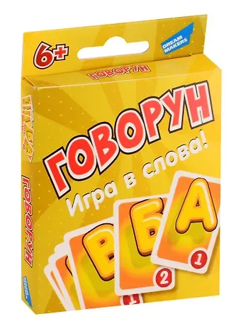 «Говорун» – это игра в слова! Игроки ходят поочерёдно, выкладывая по одной карточке с буквой. Как только кто-то замечает, что из выложенных карт можно составить слово, он его называет и забирает себе. Разные буквы приносят разное количество очков. Чем сложнее слово, тем больше шансов на победу! Игра развивает ассоциативные навыки и расширяет словарный запас. Комплектация: Игровые карточки: 73 шт.; Правила игры: 1 шт.