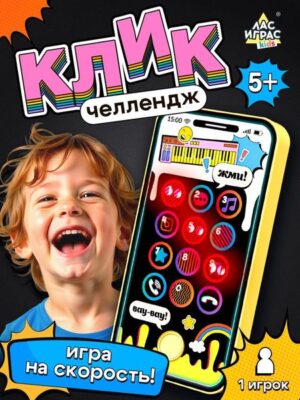 «Клик челлендж» — настольная игра для детей от 5 лет. Увлекательный смартфончик подготовил интересные задания, пройти которые сможет самый ловкий игрок. Бросьте вызов технологиям и покажите, кто самый внимательный.Как игратьВставьте батарейки и включите телефон.Для начала игры нажмите на кнопку внизу экрана.На экране начнут загораться индикаторы.Задача игрока — как можно скорее потушить все лампочки, щёлкая по ним.Как только вы потушили все индикаторы, щёлкните по кнопке внизу дисплея.Особенности набораДля работы световых и звуковых эффектов требуются 3 батарейки типоразмера ААА 1,5 V. В комплект не входят.Чтобы включить или выключить телефон, зажмите кнопку внизу.С увлекательной игрой ребёнок весело и с пользой проведёт время, развивая реакцию, фантазию и мелкую моторику.