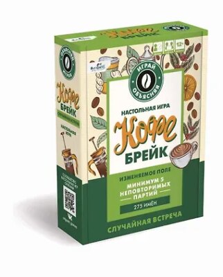 Знаменитости собрались обсудить за чашечкой кофе главные вопросы жизни, вселенной и всего такого. А игроки решили обсудить самих знаменитостей! В течение трёх раундов игрокам предстоит объяснять и угадывать известных людей (и не только!) и набирать очки, перемещая фишки по полю с разными кофейными напитками. Потренируйся объяснять на знаменитостях, которых знают все, а потом покажи тех, кого мало кто помнит. Весёлая игра для компании, в которую можно играть где угодно!