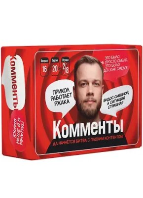 Суть игры: подобрать к карточке-обложке видео смешной комментарий из колоды комментов и показать своё крутое чувство юмора. Комменты станут вашей семейной традицией для вечеринок и досуга в кругу друзей и близких. Коробка Комменты отличный подарок по любому поводу для взрослых, подростков, мальчиков и девочек. Настолка подойдёт с собой в дорогу, для пикника, в поездку или отдых на природе. Идеальный подарок парню и любимой девушке на День Рождения. Сделай подарок мужу, маме, сестре, подарок папе, молодому человеку и коллегам на любой повод!
