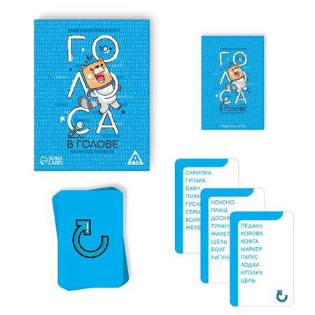 Настольная игра коммуникативная «Голоса в голове», 80 карт, 10+. <b> Голоса в вашей голове зовут…</b> В вашей голове много голосов, и все они хотят что-то вам сказать. А самое интересное: делают они это одновременно. Попробуйте за 30 секунд распознать то, что вам говорят, и получите победные очки! <b> Как играть?</b> На счет «три» включается секундомер, и все игроки одновременно начинают непрерывно называть первое слово со своей карты. Задача игрока, чей сейчас ход: постараться разобрать слова, которые ему одновременно произносят все участники, и назвать их. На это есть всего 30 секунд! Если игрок правильно услышал и назвал слово — то тот, кто его читал, произносит следующее слово со своей карты, и так далее, не останавливаясь. Как только прошло 30 секунд, участники замолкают. Игрок, чей сейчас ход, получает столько очков, сколько слов он правильно назвал за 30 секунд. Если игрок не смог разобрать ни одного слова, то он не получает очков. Далее ход переходит к следующему по часовой стрелке. Теперь он будет слушать слова. Остальные участники сбрасывают использованные карты и вытягивают новые. Игра заканчивается, как только пройдет 3 раунда. Далее участники суммируют очки, которые им удалось набрать в течение игры. Тот, у кого очков больше остальных, победил! <b> Внутри вы найдете:</b> <ul> <li> 80 карт,</li> <li> правила игры.</li> </ul> <b> Научитесь слышать голоса в своей голове!</b>