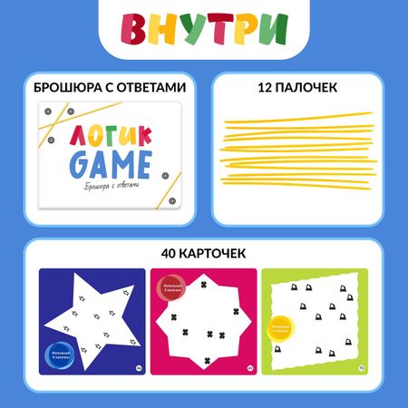 Настольная игра ЛогикGame, 1 игрок, 6+. Настольная игра «ЛогикGame» научит ребенка быстро мыслить! <b> Подготовка</b> Разложите палочки и отделите значки друг от друга. <b> Как играть?</b> <ul> <li> Берите карточку и внимательно читайте задание.</li> <li> Используйте палочки для разделения поля на зоны.</li> <li> В каждой части будет по одному значку.</li> <li> Начните задание с тремя палочками, а затем переходите на более сложный уровень</li> </ul> Помните: два значка не могут находиться в одной зоне. Чем чаще пересекаются палочки, тем ближе к истине. В буклете вы найдете правильные ответы. Игра рекомендована детям старше 6 лет.