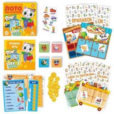 Настольная игра-лото «Идем за покупками», 32 жетона, 16 карт, 4 поля, 4 прилавка, 4 списка, 4 прайс-листа, 4 коробки для денег, 3+. <b> Развивающее лото для малышей</b> Собираетесь за покупками? Не забудьте составить список, чтобы ненароком не ошибиться. Это занимательная игра-лото, в которой участникам предстоит отправиться в магазин и купить продукты согласно своему списку. А сделать это нужно быстрее всех, ведь только так можно победить! <b> Как играть?</b> <b> 1 вариант: для самых маленьких</b> Игроки по очереди выбирают на столе по одному жетону и кладут его на свою корзину. Выбирать нужно только те продукты, которые есть в списке покупок ребенка. Игра продолжается, пока все дети не заполнят свои корзины. Здесь нет победителей, ребята просто моделируют ситуацию похода в магазин. Также можно собирать продукты на скорость. Тогда победителем станет тот, чья корзина заполнится первой! <b> 2 вариант: для детей от 3 до 6 лет</b> Для начала раздайте каждому игроку по продуктовой корзине или тележке. Каждый игрок выбирает себе список продуктов и кладет его рядом со своей корзиной. Выдавите жетоны с продуктами, тщательно перемешайте их и разложите на столе в 4 ряда по 8 жетонов в каждом рубашкой вверх. Игроки по очереди берут любой жетон на столе и переворачивают его картинкой вверх. <ul> <li> Если товар, изображенный на жетоне, указан в списке покупок игрока, то он помещает жетон в свою тележку или корзину.</li> <li> Если жетон не подходит, он кладет его обратно на прилавок рубашкой вверх.</li> </ul> Жетон стоит показывать остальным участникам только в том случае, если он вам подходит. Если в вашем списке покупок такого товара нет, не показывайте жетон, а просто верните его обратно рубашкой вверх. Игра продолжается, пока один из игроков не соберет в свою тележку все товары, указанные в его списке покупок. Этот игрок и становится победителем! <b> 3 вариант: для детей от 5 лет</b> Разместите в центре стола все прилавки. Разделите жетоны по категориям и разложите их на прилавке в случайном порядке рубашкой вверх. То есть на прилавке «Фрукты и овощи» должны лежать только жетоны с фруктами и овощами, а на прилавке «Игрушки» — только игрушки и так далее. Далее каждый игрок получает продуктовую корзину, список покупок, прайс-лист, коробочку для денег и определенное количество монет. Затем игроки по очереди выбирают любой прилавок и переворачивают любой жетон на нем. <ul> <li> Если товар, изображенный на жетоне, указан в списке покупок игрока, то он покупает его и помещает данный жетон в свою тележку или корзину.</li> В списке покупок есть прайс-лист, который показывает, сколько стоит тот или иной продукт. Например, если бананы стоят 3 монеты, значит, игрок сможет их получить, только если заплатит эту сумму монетами любого номинала. Использованные монетки нужно поместить в свою коробочку для денег. В игре они больше использоваться не будут. <li> Если данный жетон не подходит, игрок кладет его обратно на прилавок рубашкой вверх. Платить при этом деньги не нужно, участник просто завершает ход.</li> </ul> После этого ход переходит к следующему игроку по часовой стрелке. Игра продолжается, пока один из игроков не соберет в свою тележку все товары, указанные в его списке покупок. Он и становится победителем! <b> Внутри вы найдете:</b> <ul> <li> 4 продуктовые корзины (игровые поля);</li> <li> 4 списка покупок;</li> <li> 4 карточки-п