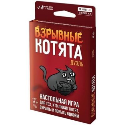 В целом мире остались только вы вдвоём…Ну и взрывные котята, конечно же. Берите карты из колоды, пока кто-то из вас не вытянет взрывного котёнка и не превратится в кучку пепла. Если, конечно, не обезвредит пушистое зло лазерной указкой или почёсыванием пузика.Правила те же, что и всегда: подсовывай котят на верх колоды, заставляй соперника делать больше ходов или даже отменяй его действия. Проще говоря, играй карты, затем бери и постарайся не взорваться.