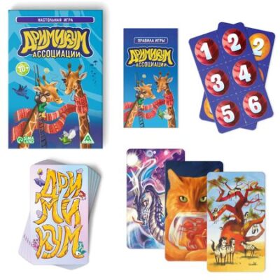 Настольная игра на ассоциации и воображение «Дримикум. Ассоциации», 70 карт, 10+. Вообразите только, сколько ассоциаций можно придумать, глядя на одно изображение! Как играть? К одной и той же картинке каждый участник будет подбирать свои карточки с символами, причем так, чтобы этот символ совпадал с выбором большинства игроков. Откройте новые границы воображения! Состав: <ul> <li> 64 карточки с картинками</li> <li> 6 карт с жетонами</li> <li> правила игры</li> </ul> Играйте и веселитесь вместе с ЛАС ИГРАС!