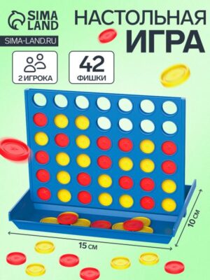 Настольная игра на логику «Звезда», четыре в ряд, 10×15 см. Игра рассчитана на 2 игроков. Один участник ходит желтыми, второй — красными фишками. Игроки встают по разным сторонам доски и по очереди заполняют слоты фишками своего цвета. Выигрывает тот, кто первым составил ряд из 4 фишек вертикально, горизонтально или по диагонали.