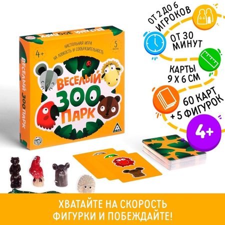 Переполох в зоопарке! Утро! Директор зоопарка пришел на работу, но вот ужас! Все звери поменялись местами, что же делать? Нужно срочно вернуть всех на свои места! А для этого нужно быть ловким, быстрым и сообразительным. С чего начать? Перед началом игры поставьте все пять фигурок на столе по кругу. Самое главное — расположите фигурки так, чтобы всем было удобно до них дотянуться. Все карточки хорошенько перетасуйте и положите рубашкой вверх в одну стопку рядом с фигурками. Барашки, медведи … кого же хватать? Все просто, нужно быстрее всех схватить нужный предмет – ту фигурку, которая изображена на карточке! Да так, чтоб цвет животного на карточке совпадал с реальным цветом фигурки. Кто сделает это первым, забирает карточку себе, а фигурку необходимо вернуть обратно. Если на карточке нет ни одного необходимого изображения, важно быстро схватить фигурку, которой нет на карте, или фигурку такого цвета, которого там тоже нет. Победителем станет тот, кто соберет наибольшее количество карточек! Что в наборе? 5 фигурок; 60 карточек; правила игры. Хватай скорей, опереди друзей!