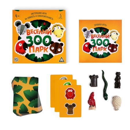 Настольная игра на ловкость «Веселый зоопарк», 60 карт, 4+. <b> Переполох в зоопарке! </b> Утро! Директор зоопарка пришел на работу, но вот ужас! Все звери поменялись местами, что же делать? Нужно срочно вернуть всех на свои места! А для этого нужно быть ловким, быстрым и сообразительным. <b> С чего начать? </b> Перед началом игры поставьте все пять фигурок на столе по кругу. Самое главное — расположите фигурки так, чтобы всем было удобно до них дотянуться. Все карточки хорошенько перетасуйте и положите рубашкой вверх в одну стопку рядом с фигурками. <b> Барашки, медведи … кого же хватать? </b> Все просто, нужно быстрее всех схватить нужный предмет – ту фигурку, которая изображена на карточке! Да так, чтоб цвет животного на карточке совпадал с реальным цветом фигурки. Кто сделает это первым, забирает карточку себе, а фигурку необходимо вернуть обратно. Если на карточке нет ни одного необходимого изображения, важно быстро схватить фигурку, которой нет на карте, или фигурку такого цвета, которого там тоже нет. Победителем станет тот, кто соберет наибольшее количество карточек! <b> Что в наборе? </b> <ul> <li> 5 фигурок; </li> <li> 60 карточек; </li> <li> правила игры. </li> </ul> <b> Хватай скорей, опереди друзей! </b>