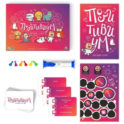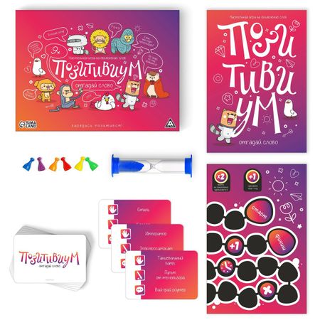Настольная игра на объяснение слов «Позитивиум», 100 карт, 9+. <b> Играем и объясняем слова разными способами</b> Осторожно! Есть риск, что эта игра станет одной из самых любимых. Почему? Потому что здесь нужно объяснять слова разными способами и передвигаться по игровому полю. Соревноваться можно как командами, так и каждый сам за себя. А победителем станет тот, кто быстрее всех доберется до финиша! <b> Как играть?</b> Первый игрок команды вытягивает верхнюю карточку из колоды. Игроки из команды соперников включают секундомер на 1 минуту — именно столько времени дается на объяснение. На каждой карте есть 3 слова, которые нужно объяснить разными способами: <ul> <li> с помощью слов, не используя однокоренные слова;</li> <li> рисунком;</li> <li> пантомимой.</li> </ul> Задача игрока — объяснить все 3 слова с карточки своей команде. Игрок может сам выбрать, в каком порядке он будет объяснять. Задача команды — как можно скорее отгадать эти слова. Посчитайте слова, которые были отгаданы в раунде. Именно на столько клеток передвигается фишка команды, игрок которой объяснял слова. Если ни одно слово не было угадано, фишка остается на месте. Далее ход переходит к команде соперников. Игрок из этой команды также вытягивает карточку из колоды и пытается объяснить все 3 слова за 1 минуту. Игра заканчивается, когда фишка одной из команд доберется до финиша. Эта команда объявляется победителем! <b> Внутри вы найдете:</b> <ul> <li> игровое поле,</li> <li> песочные часы,</li> <li> 100 карт,</li> <li> 6 фишек игроков,</li> <li> правила игры.</li> </ul> <b> Играйте и веселитесь вместе с ЛАС ИГРАС!</b>
