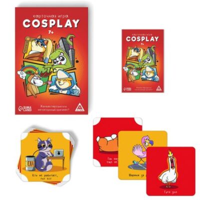 Настольная игра на объяснение слов Cosplay, 120 карт, 7+. <b> Жалкая пародия vs Неповторимый оригинал</b> В этой игре вам предстоит заняться косплеем — то есть перевоплощаться в персонажей на карточках. Остальные участники должны отгадать, кого вы изображаете. Где жалкая пародия, а где неповторимый оригинал? Это и предстоит выяснить. <b> Как играть?</b> Для начала разделите карты на две колоды и выберите цвет, которым будете играть. Одну колоду разложите рядами на столе, а другую — в одну стопку рубашкой вверх. Определите, кто за кем ходит, и начинайте. Участники по очереди вытягивают карточки из колоды, а затем повторяют позы и мимику персонажа на картинке. Двигаться при этом не нужно. Издавать звуки тоже. Чтобы максимально передать изображение, игрок может взять любой подручный предмет. Задача остальных участников — найти этого персонажа в карточках на столе, указать на него и выкрикнуть надпись под картинкой. Тот, кто сделает это первым, забирает карту. Игра продолжается до тех пор, пока на столе останется только одна карта. Затем игроки подсчитывают карты, которые набрали в течение игры. Тот, кто набрал больше всех — победил. Играть можно в формате «каждый сам за себя» или делиться на команды. <b> Внутри вы найдете</b> <ul> <li> 120 карт.</li> <li> Правила игры.</li> </ul> <b> Игра на объяснение слов по-новому.</b>