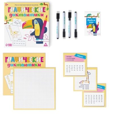 Настольная игра на пространственное мышление «Графические диктантики», 30 карт, 4 планшета, 4 маркера, 5+. Игра на пространственное мышление В этой игре участникам предстоит рисовать графические диктанты по координатам. Играть можно как одному, так и детской компанией. Задания выполняются на ламинированных планшетах, поэтому игра прослужит вам долго. Достаточно лишь стереть рисунок обратной стороной маркера. Игра развивает: <ul> <li> мелкую моторику рук логику</li> <li> пространственное мышление</li> <li> внимательность</li> </ul> Состав: <ul> <li> 4 планшета</li> <li> 4 маркера</li> <li> 30 карт с заданиями</li> <li> правила игры</li> </ul>