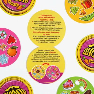 Настольная игра на реакцию и внимание «Дуббль. Версия 2.0», 55 карт, 5+. <b> «Дуббль» в новом исполнении!</b> Теперь любимая игра на внимание и реакцию в жестяной коробочке! Внутри вас ждет 55 карт с уникальным набором картинок. На каждой паре карт есть одно общее изображение. Его-то вам и нужно найти! Кстати, в обычной игре «Дуббль» карточки с белым фоном, а здесь — с цветным. На процесс игры это не влияет, просто делает карточки еще ярче! <b> Как играть?</b> На счет «три» все участники переворачивают свои карточки и смотрят, какое изображение на их карточках совпадает с верхней картой из колоды (каждый ищет совпадение карты в центре стола со своей картой). Первый, кто отыщет такую картинку, кричит ее название, забирает верхнюю карту из колоды и кладет ее сверху на свою карту. Тем самым он открывает следующую карточку из основной колоды. Теперь совпадения нужно искать уже с другими картинками. А как только все карты в колоде закончатся, переходите к подведению итогов. Игрок, который набрал больше всех карт, объявляется победителем! <b> Внутри вы найдете</b> <ul> <li> 55 карт.</li> <li> Правила игры.</li> </ul> <b> Играйте, хватайте и побеждайте!</b>