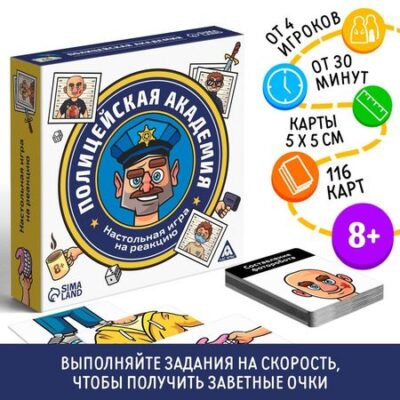 Проверьте свою реакцию и внимание!Вы поступаете в Полицейскую академию. У каждого из вас будет напарник, с которым вам предстоит справляться со всеми заданиями. В конце курса вас ждёт экзамен, который определит вашу дальнейшую судьбу. Здесь вы сможете потренироваться в скорости, внимательности и умении задерживать преступников. Самое главное — хорошо сработаться с напарником, действовать быстро и слаженно, чтобы опередить по очкам другие команды. Удачи, студенты!Как играть?Сначала разделитесь на команды, в каждой команде должно быть 2 человека. Вся игра состоит из 4 раундов: «Составление фоторобота», «Опознание преступника», «Задержание» и «Экзамен». В каждом раунде вам с напарником предстоит выполнять задания на скорость, чтобы получить заветные очки. Чем больше очков, тем ближе вы к победе и к зачислению в Полицейскую академию.Вам предстоит составлять фоторобот из карт персонажей, на скорость искать нужных персонажей, подкидывать карточки так, чтобы они встали в нужное положение и делать многое другое.После того, как каждая команда поучаствовала в экзамене, раунд завершается. Подведите итоги экзамена: подсчитайте, сколько очков за всю игру удалось набрать командам. Команда, которая набрала очков больше всех, победила!Внутри вы найдёте:116 карт,правила игры.Научитесь работать в команде!