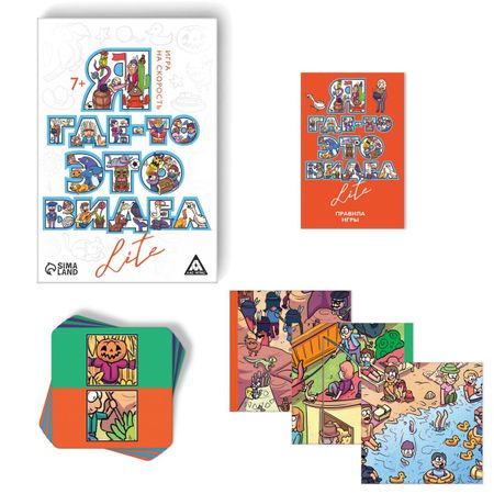 Настольная игра на скорость «Я где-то это видел LITE», 120 карт, 7+. <b> Настольная игра на объяснение слов</b> Перед вами мини-версия игры «Я где-то это видел», в которой вам предстоит на скорость искать фрагменты изображений на игровом поле. Внутри вас ждут 280 заданий и 4 сюжетных поля-картины, составленных из карт как пазл. Чего же вы ждете? Скорее собирайте друзей или близких и начинайте игру! <b> Как играть?</b> Первый игрок переворачивает верхнюю карту в колоде так, чтобы все одновременно увидели ее содержание. Теперь задача игроков — как можно быстрее найти точно такой же фрагмент на поле из карт. Тот, кто первым нашел нужный фрагмент, кричит «нашел!» и указывает на данный фрагмент на поле. Этот игрок забирает карту с заданием и откладывает ее рядом с собой до конца игры. Если игрок ошибся, он сбрасывает заработанную карту. Если карт пока нет, то игрок ничего не сбрасывает. Игра продолжается до тех пор, пока в колоде с заданиями не закончатся карты. Далее участники подсчитывают, сколько карт им удалось набрать в течение игры. Тот, кто набрал больше карт, победил! <b> Внутри вы найдете:</b> <ul> <li> 64 карты,</li> <li> правила игры.</li> </ul> <b> Играйте и объясняйте слова разными способами!</b>