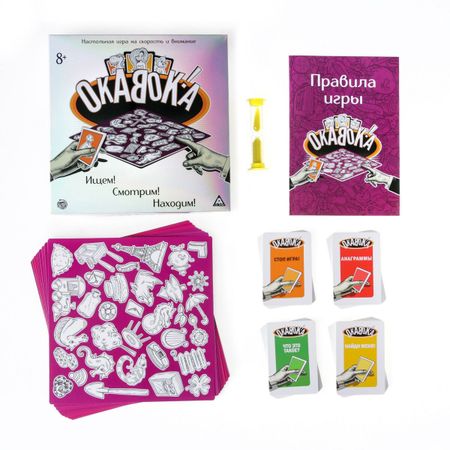Настольная игра на скорость «ОКАВОКА», 90 карт, 8+. <b> Встречайте любимую игру «Окавока» в новом исполнении!</b> Перед вами очень полезная игра. Она поможет натренировать скорость, внимание, память и даже ассоциативное мышление! Главная задача участников: быстрее всех отыскать предмет на поле. А сделать это не так просто, ведь время ограничено! <b> Что нужно делать?</b> Вытягивайте карточки и выполняйте задания — ищите то, что изображено или написано на них. А если вам попадется карточка «Анаграммы», то вы увидите на ней 2 слова, буквы в которых перепутаны. Задача игроков: понять, что это за слово и отыскать его на игровом поле. Карточку забирает тот игрок, кто быстрее всех найдет нужный предмет и крикнет «Окавока!». Множество вариаций игры не даст вам заскучать, играйте с друзьями или всей семьей, проверьте свою реакцию и внимательность. <b> Игра кажется слишком простой?</b> Тогда после каждого круга меняйте положение полей (например, сдвигайте их по часовой стрелке) и переворачивайте их. Так каждый круг положение объектов будет меняться, и искать их будет еще сложнее. <b> Игра развивает</b> <ul> <li> Внимание.</li> <li> Ассоциативное мышление.</li> <li> Смекалку.</li> <li> Логику.</li> <li> Скорость реакции.</li> </ul> <b> Внутри вы найдете</b> <ul> <li> 9 игровых полей.</li> <li> 90 карт с заданиями.</li> <li> Песочные часы.</li> <li> Правила игры.</li> </ul> <b> Играйте и побеждайте вместе с «ЛАС ИГРАС»!</b>
