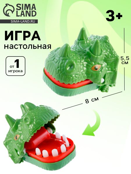 Настольная игра на везение «Безумный трицератозавр», от 1 игрока, 3+. Всегда будьте начеку с настольной игрой «Безумный трицератозавр», ведь динозавры ошибок не прощают! Пересчитайте зубы ящеру, пока он не проснулся! <b> Как играть</b> <ol> <li> Откройте рот динозавру.</li> <li> По очереди нажимайте на зубы.</li> <li> В одном из зубов динозавра спрятана ловушка. Если игрок нажмет на нее, рот рептилии захлопнется!</li> <li> Игрок, который попался в ловушку и угодил в зубы динозавра, проиграл.</li> <li> Придумайте проигравшему веселый фант и начинайте снова!</li> <li> Играйте на выбывание — участник, которому удалось избежать ловушки, объявляется победителем!</li> </ol> <b> Чем полезна настольная игра</b> С настольной игрой «Безумный трицератозавр» ребенок разовьет тактильное восприятие, мелкую моторику и скорость реакции, прокачает координацию движений. Занимательная игра в компании друзей отвлечет ребенка от гаджетов и поможет весело провести время.