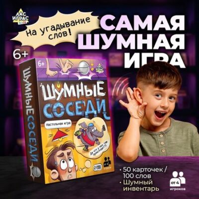 Игра «Шумные соседи» — это весёлая командная забава, где участники угадывают слова. Идеально подходит для семейных вечеров или встреч с друзьями. Подходит для компании от 4 игроков, начиная с 6 лет и старше.ОсобенностиДва уровня сложности. На карточках две стороны: лёгкие слова на зелёной стороне и более сложные на жёлтой.50 карточек, 100 слов. Каждая карточка содержит два слова, что даёт широкий выбор для игры.Участники работают вместе, чтобы победить. Временные ограничения добавляют азарта и драйва, делая каждый раунд напряжённым и захватывающим.Как играть?Разделитесь на две команды. В каждой команде должен быть Шумный сосед и Подслушивающие.Подслушивающие стоят за стеной и пытаются отгадать, какое слово изображает их Шумный сосед. У подслушивающих есть всего 1 минута на отгадывание.Побеждает команда, которая отгадает больше слов!Польза для развития«Шумные соседи» отличный способ провести время с семьёй или друзьями. Она развивает воображение, креативность и навыки коммуникации. Игроки любого возраста быстро вовлекаются в процесс и получают удовольствие от взаимодействия. Настольная игра станет лучшим подарком для компаний, где ценят активное времяпрепровождение и смех.