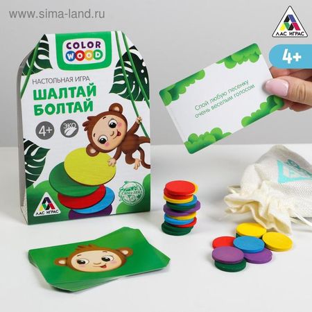 «Падающая башня» по-новому!Вместо обычных брусков здесь вы найдёте круглые фишки. Стройте башню и старайтесь сделать так, чтобы она не рухнула. Тот, кто обрушил конструкцию, выполняет весёлый фант.Как играть?Раздайте каждому игроку по 10 фишек. А ещё перемешайте карточки с фантами и сложите в одну колоду рубашкой вверх. Осталось только определить очерёдность хода и начать игру.Первый участник выкладывает в центр стола любую из своих фишек. Следующий игрок по часовой стрелке кладёт фишку поверх первой. Чтобы насолить другим, можно выкладывать фишку, выходя за края предыдущей.Тот, кто в свой ход обрушил башню, становится проигравшим и выполняет фант. А побеждает участник, который выкладывал свою фишку перед ним.После игры все компоненты можно убрать в мешок, чтобы ничего не потерялось.Внутри вы найдёте50 деревянных фишек.10 карт с фантами.Правила игры.Мешок для хранения.Играйте и веселитесь вместе с ЛАС ИГРАС!