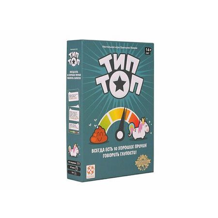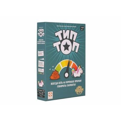 Вы со своими друзьями на одной волне? Проверьте это на деле! Тип-Топ — это кооперативная игра (все участники играют в одной команде). В каждом раунде капитан берёт верхнюю карту с темами, выбирает одну из них и зачитывает ее вслух. Задача игроков — дать ответ, соответствующий номеру на карте (от 1 до 10). Но всё не так просто! Капитан должен расположить ответы в порядке возрастания. Тут нужно подумать! Сложная задача, не так ли? Теперь проверьте свои способности! Преимущества игры: • Подойдет для семейного досуга и вечеринки друзьями; • Смешные и интересные темы заданий; • Веселое оформление с единорогами; • Легкие и понятные правила, короткая подготовка партии; • Два уровня сложности. Игра рекомендована известным психологом Валентиной Паевской.