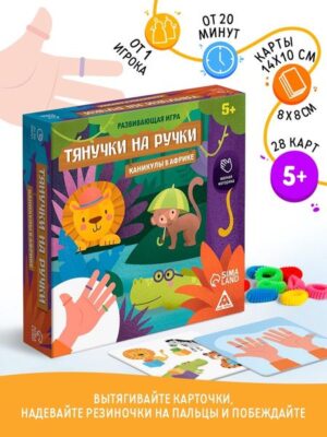 Развиваем ловкость пальчиков, внимательность и быстроту реакции в увлекательной игровой форме!В этой динамичной игре вас ждут захватывающие испытания с разноцветными резинками. Соберите весёлую компанию друзей или родных и устройте азартные состязания на скорость!Что нужно делать?Задача игроков — собрать как можно больше выполненных карточек. А сделать это помогут резиночки на пальцах. На карточках изображены различные комбинации, которые нужно воспроизвести на пальцах с помощью резинок. Как только игрок справился с заданием, он громко объявляет: “Готово!”. И начинается проверка:если всё верно, игрок забирает карту себе;если неправильно, карта уходит в колоду сброса.А побеждает тот, кто наберёт больше всего карточек!Внутри вы найдёте:30 карточек с заданиями36 резинокправила игрыИдеальный выбор для активного досуга и развития малышей в кругу семьи и друзей!