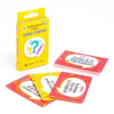 Настольная игра — викторина «Давай, отвечай», 32 карточки. Отличная игра для веселой компании, в которой необходимо вытягивать вопросы и ответы из предложенных карточек. Получиться могут самые неожиданные комбинации. Материал: картон. Количество игроков: 3+. Возраст: 12+