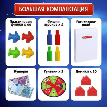 Настольная экономическая игра Монополия «Магические приключения», 2-4 игрока, 7+. Станьте великим магом и получите как можно больше наград. Проиграет тот, у кого закончатся деньги и награды. <b> Подготовка к игре</b> Каждый участник игры выбирает себе фишку-самолет любимого цвета и ставит ее на клетку «Старт». Маленькие фишки того же цвета также нужно взять в свой запас. Перед началом игры каждому участнику выдаются денежные купюры: <ul> <li> 9 купюр номиналом 100;</li> <li> 4 купюры номиналом 200;</li> <li> 1 купюра номиналом 500.</li> </ul> Важно остальные деньги положить в большие отсеки на игровом поле. 1 из игроков берет на себя роль Волшебного Банкира и в процессе игры отвечает за деньги. Каждый игрок может выбрать отсек для хранения личного банка. Чтобы не перепутать банки игроков, можно положить маленькую фишку своего цвета в отсек. <b> Как играть</b> Когда все фишки-самолеты на клетке «Старт» — игра начинается. 1-й игрок крутит стрелку рулетки № 1 и ходит на то количество полей, которое соответствует выпавшей цифре. <b> Если фишка попала на следующие поля:</b> <ul> <li> <b> «Награда»</b> . Игрок может приобрести ее, заплатив указанную сумму. После нужно поставить свою маленькую фишку на приобретенную ячейку.</li> <li> <b> «Заплати» или «получи»</b> . Заплатить за ту или иную услугу в Волшебный Банк и получить ее там же.</li> <li> <b> «Крути рулетку»</b> . Нужно вращать стрелку на рулетке № 2 и выполнить то, что она указала.</li> <li> <b> «Вернись на клетку Старт»</b> . Нужно вернуться в начало игры.</li> <li> <b> «Магический шкаф»</b> . Игроку крупно не повезло и нужно вращать рулетку № 1, но смотреть на результат внешнего поля. Если волшебство удалось то, игрок обходится штрафом в размере 30, а в свой следующий ход может ходить снова. Если волшебство не удалось, то игрок платит 30, но в свой следующий ход снова крутит рулетку.</li> <li> <b> «Колесо фортуны»</b> . Игрок, чья фишка встала на этот сектор, приглашает любого действующего игрока проверить свои волшебные способности. Они по очереди крутят рулетку № 1. Чья цифра больше, тот и платит своему оппоненту 20.</li> <li> <b> «Ходи дважды»</b> . В свой ход игрок может сделать 2 хода подряд.</li> </ul> После того, как 1-й игрок сделал свой первый ход, в игру вступает следующий игрок. И действует по тем же правилам. Если фишка игрока остановилась на Награде, которую приобрел другой игрок, то он должен заплатить ему ту сумму, которая указана на ячейке в графе Сумма. Каждый раз, как только игрок проходит через клетку «Старт» или возвращается на нее с клетки «Вернись», он получает из Волшебного Банка 200. Кроме 1-го хода. Начиная со 2-го круга игрок может увеличить значимость своей Награды. Если он повторно встал на клетку со своей наградой, то может внести доплату в общий Волшебный Банк и построить там дом. Для этого маленькую фишку нужно заменить на домик того же цвета. После этого другой игрок, вставший на клетку с домом, будет платить большую сумму. <b> Полезно</b> На 2-й стороне поля есть ячейки. Каждый игрок перед началом игры может выбрать для себя дорожку и дублировать маленькими фишками свои награды. Это дает наглядное понимание приобретенных наград, а в конце игры это ускоряет процесс определения победителя. <b> Вот так ситуация</b> <ul> <li> Каждый игрок может увеличить ценность не более 5 своих наград. То есть поставить свои домики.</li> <li> Если у игрока закончились деньги, он может начать продават