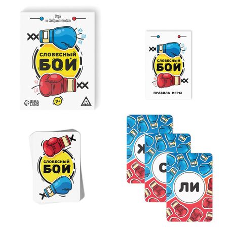 Настольная коммуникативная игра «Словесный бой», 100 карт, 7+. <b> Сразитесь с друзьями в словесном поединке!</b> Сколько слов со слогом «да» вы можете назвать? А если вас много, и повторяться нельзя? Уже не так просто, но все равно очень весело. Собирайте друзей, устраивайте настоящие словесные поединки и побеждайте! <b> Что нужно делать?</b> Вас ждут карточки, на каждой из которых написан слог или сочетание букв. Задача участников – придумать слово, в котором есть этот слог. Так участники по очереди называют одно слово. Тот, кто не может назвать, выбывает из розыгрыша данной карты. А тот, кто назвал больше всех, забирает себе эту карту. Как думаете, кто победит? Конечно тот, кто наберет больше всего карточек! <b> Игра развивает:</b> <ul> <li> внимание,</li> <li> словарный запас,</li> <li> память.</li> </ul> <b> Внутри вы найдете:</b> <ul> <li> 100 карточек,</li> <li> правила игры.</li> </ul> <b> Кто назовет больше всех слов?</b>