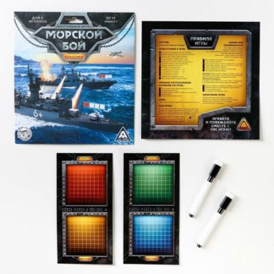 Настольная стратегическая игра «Морской бой. Классика», 6+. <b> Устройте морской бой прямо у себя дома!</b> Это увлекательная стратегия, которая знакома всем с детства. Что нужно делать? Рисовать на поле корабли разного размера и пытаться потопить флот соперника. Выстраивайте свою стратегию, будьте предельно внимательны, и победа за вами! <b> Для победы вам нужно:</b> <ul> <li> найти достойного соперника;</li> <li> разместить все свои корабли на поле так, чтобы они не касались друг друга;</li> <li> раздать каждому игроку по маркеру и карточке для отметки выстрелов;</li> <li> внимательно отмечать каждый выстрел и потопить все корабли соперника раньше, чем пойдете на дно.</li> </ul> <b> Внутри вы найдете:</b> <ul> <li> планшеты игроков, 2 шт.;</li> <li> маркеры, 2 шт.;</li> <li> правила игры.</li> </ul> <b> На абордаж!</b>