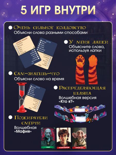 Настольные игры «Всевозможные волшебные настолки», набор 5 игр, от 3 игроков, 10+. Набор «Всевозможные волшебные настолки» — это пять захватывающих игр, которые переносят игроков в мир магии, тайн и веселья. Идеально подойдут для семейных вечеров, встреч с друзьями или тематических праздников. <b> 5 игр в наборе</b> <ul> <li> <b> Очень сильное колдовство.</b> На вас наложили ограничительное заклятье! Вам нужно объяснить, что случилось, используя только доступные вам способы.</li> <li> <b> У меня лапки.</b> Упс! В ваше Оборотное зелье попала кошачья шерсть, и теперь у вас… лапки! Объясняйте слова с их помощью.</li> <li> <b> Сам-знаешь-что.</b> Объясните слово, не называя его и похожие на него слова.</li> <li> <b> Распределяющая шляпа.</b> Отгадайте, кого в вас разглядела распределяющая шляпа!</li> <li> <b> Пожиратели смерти.</b> В вашу компанию затесались Пожиратели смерти! Раскройте их, пока они не расправились с вами!</li> </ul> <b> Особенности</b> <ul> <li> Внутри вы найдете все необходимое: кубик, песочные часы, карточки персонажей, маркер, ободки и даже кристаллы.</li> <li> Игры помогают развивать коммуникацию, логику и креативность. Это не просто развлечение, но и инструмент для развития мягких навыков.</li> </ul> Набор заменяет несколько отдельных игр — экономьте место на полке. Подходит подросткам от 10 лет и взрослым: правила адаптированы для быстрого старта. Этот набор станет находкой для тех, кто ценит дружескую атмосферу и увлекательные механики. Подарите себе и близким магию, которая объединяет!
