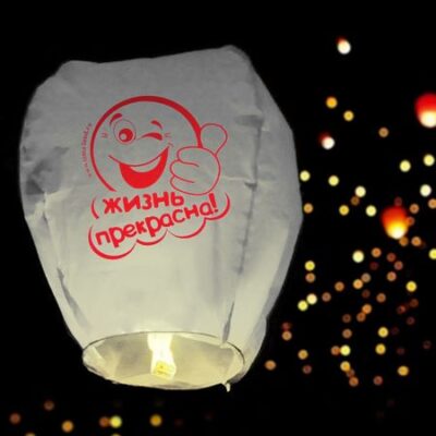 Небесный фонарик «Жизнь прекрасна!», купол, белый. Фонарик действует по принципу воздушного шара. Объемная конструкция сделана из бумаги, пропитанной антигорючей смесью. В нижней части купола на проволоке закреплена свеча-горелка. Она разогревает воздух внутри фонарика, поднимает его вверх и эффектно подсвечивает изнутри, создавая таинственный ореол. Длительность полета составляет около 20 минут — за это время бумажный фонарик поднимается на высоту до 200 метров. С помощью небесного фонарика вы сможете ярко завершить значимое событие в жизни, любое мероприятие станет запоминающимся с таким праздничным атрибутом.