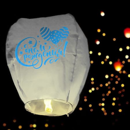 Небесный фонарик «С днем рождения», купол, белый. Фонарик действует по принципу воздушного шара. Объемная конструкция сделана из бумаги, пропитанной антигорючей смесью. В нижней части купола на проволоке закреплена свеча-горелка. Она разогревает воздух внутри фонарика, поднимает его вверх и эффектно подсвечивает изнутри, создавая таинственный ореол. Длительность полета составляет около 20 минут — за это время бумажный фонарик поднимается на высоту до 200 метров. С помощью небесного фонарика вы сможете ярко завершить значимое событие в жизни, любое мероприятие станет запоминающимся с таким праздничным атрибутом.